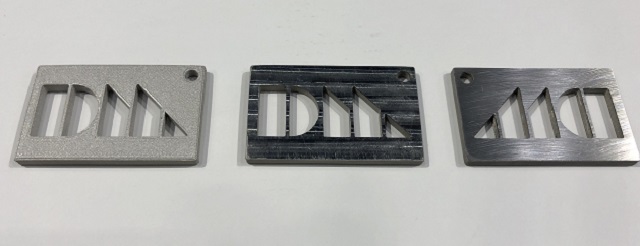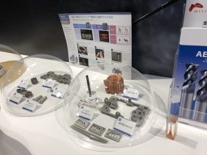 オーエスジー株式会社様は愛知県豊川市の本社オーエスジーCSセンターにて、優れた設備と高い技術で各種切削実験を有償で行われていて、今回はDesktop Metal Studioシステムで作成した、難削材とされるSUS316Lのパーツの水平面を、超硬防振型エンドミル「AM-VEL」で平面仕上げ(写真中央)や追加研磨加工(写真右)をしていただき、サンプル展示により、このような加工で実用部品・治工具の製造を提案しました。
