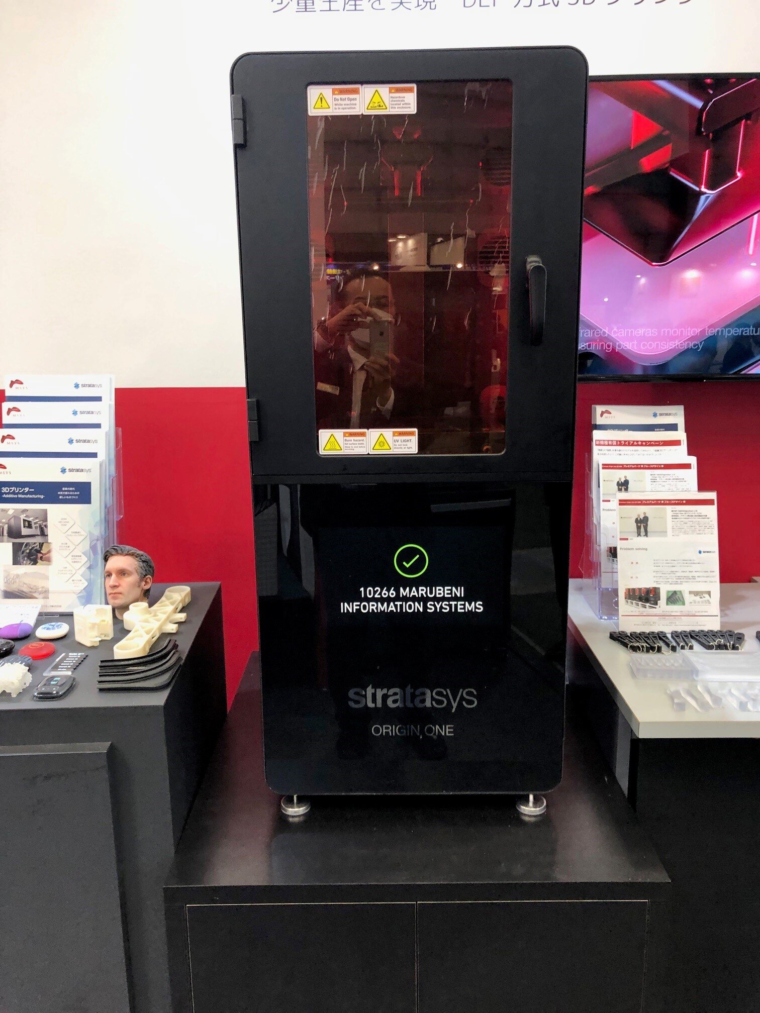 その他にもDesktop Metal社Studioシステムプリンター、Stratasys社のOriginOneプリンター、J35Proプリンターなども実機で実際に作っている状態を展示しました。