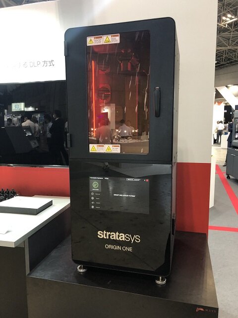 樹脂ではStratasys社製品として、国内でも導入が増えている量産対応DLP方式3DプリンターStratasys OriginOneの実機とサンプル、植物原料ナイロン11で実部品量産が出来る新製品H350のサンプル、