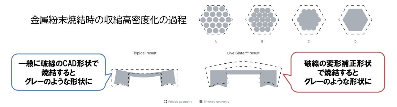 | LiveSinterソフトウエア | ⑤ファーネスで行う加熱脱脂と金属固相焼結緻密化で起こる複雑な収縮現象を解析シミュレーションし、その結果から立体補正形状を生成し、②プリンターで使うファイルを出力する |