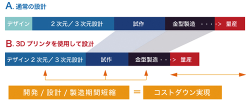 オフィスに3Dプリンターがあれば、すぐに自社内で試作品をつくることが可能になります。試作を外注した時の納品を待つ時間がなくなれば、開発期間全体の短縮が期待できます。