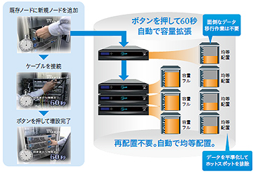 独自の分散ファイル システムにより、20PB以上の大容量ストレージをワンファイルシステムでかんたんに管理することが可能なストレージです。ノード単位で容量を拡張でき、規模が大きくなるとともに性能も向上するという、スケールアウトストレージ独自の特長を備えています。