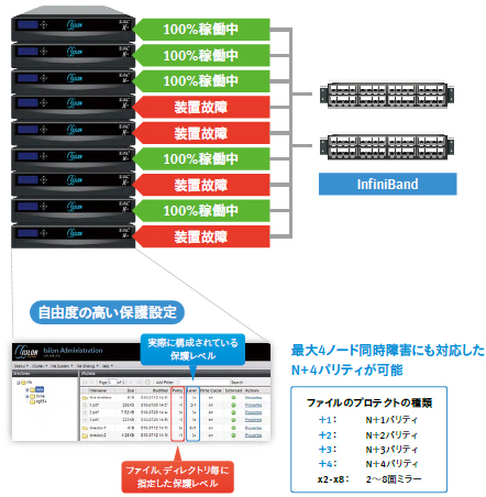 PowerScaleでは、ファイルの読み書きは独自のファイル システムであるOneFS®の分散処理によって行われます。OneFSにはRAIDグループの考え方はなく、ファイルを保存する際にパリティを付けてノード毎にストライピング データを保護する仕組みが採られています。付与できるパリティは最大4つで、その場合は4ノードの同時障害が発生しても耐えうる設計になっています。