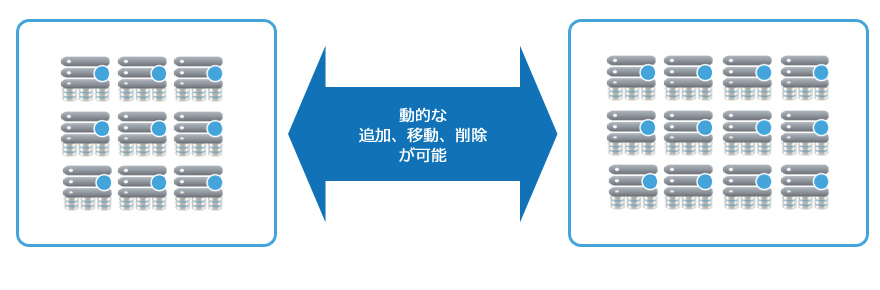 柔軟な導入により、複数のサーバー、構成、OS、メディアタイプなどあらゆる形に対応でき、ハイパーコンバージドへの移行も可能です。リソースの追加、削除、移動を直ちに行えます。ダウンタイムは発生しません。