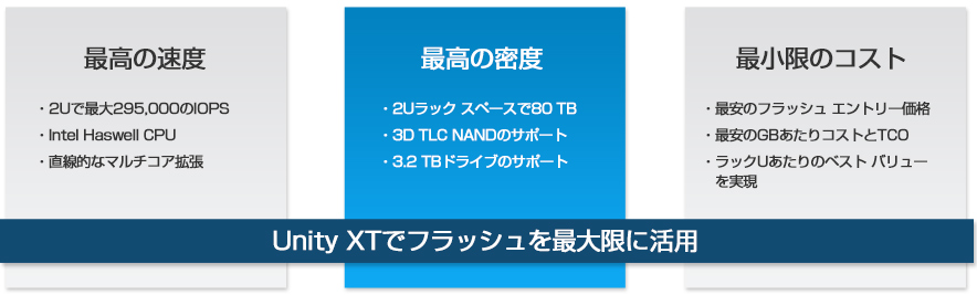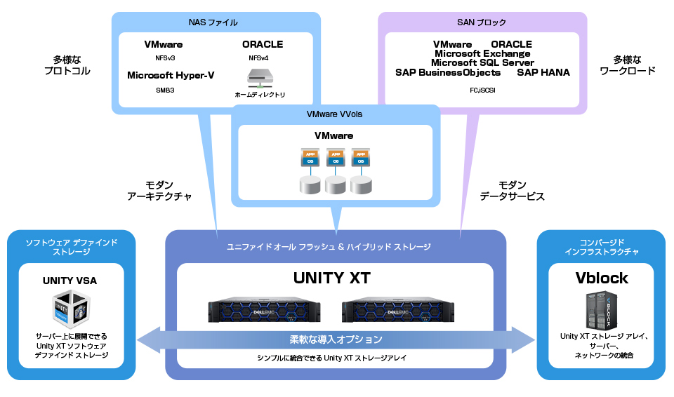 Unity XTは、コンパクトなUnity XTプラットフォーム(オールフラッシュ/ハイブリッド)、コンバージド インフラストラクチャ、ソフトウェア デファインドストレージVSAから選択可能で、手頃なエントリー価格と全体的に低いTCOにより、ミッドレンジ フラッシュとして優れた経済性を実現。