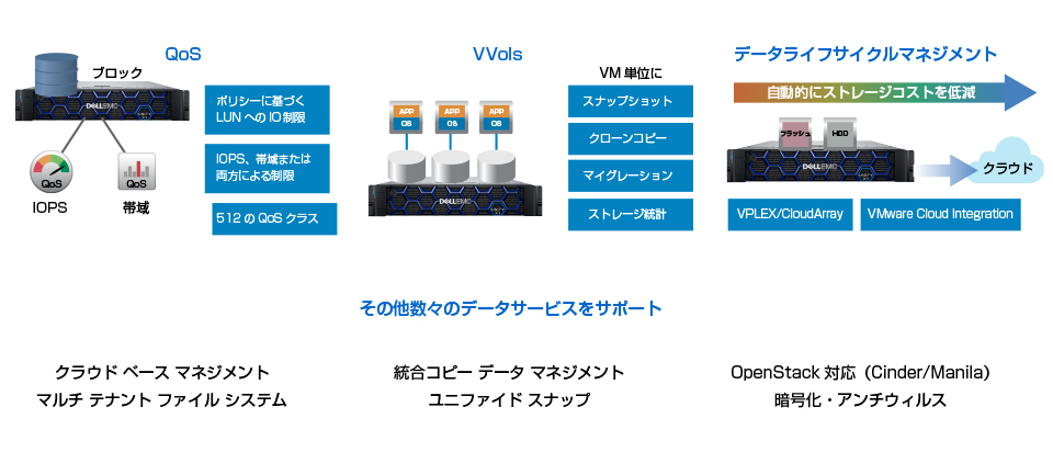 | オールインワン ソフトウェア | インライン データ削減、同期/非同期レプリケーション、スナップショット、マルチコア最適化、QoS、FLR、IPマルチ テナンシー、Webベース管理、SSDキャッシュ、自動階層化、シン プロビジョニング、CloudIQ、クラウド階層化、ストレージM&R、RPおよびAppSync Basicライセンス | |||