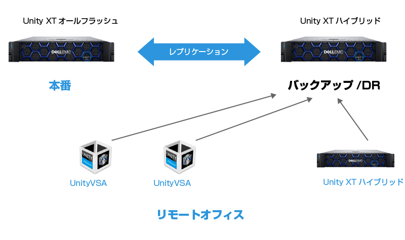 Unity XTオールフラッシュ、ハイブリッド、仮想(VSA)間でのレプリケーション。