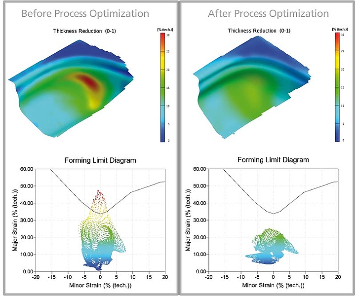 - 最大・最小主ひずみ, 板厚減少率, 3D形状/幾何形状, X/Y/Z変位などの計算および比較評価
