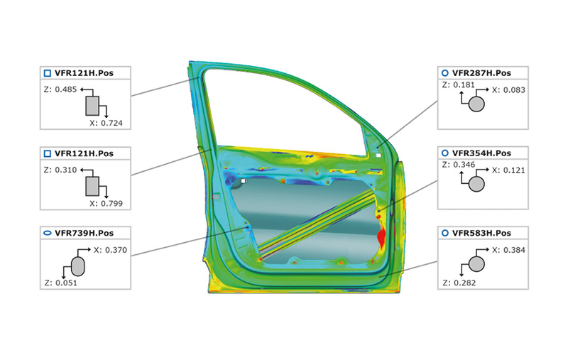 全てのデータ取得が実行された後にソフトウェアはポリゴン処理を行い、検査計画に基づいて実測値を計算します。このデータは設計CADデータと比較してレポート表示されます。測定結果は特別なエクスポート形式(例:SQC:統計品質管理データベースなど)で自動的に保存されます。さまざまな測定物の測定手順の場合も完全に自動実行できます。