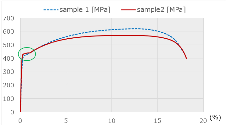 当初の予想の通り降伏点近傍において、サンプル1では降伏点から応力がどんどん増加してそのまま塑性変形に至る一方、サンプル2は降伏時の応力がサンプル1より高く、降伏点で一旦応力が増加しないまま伸びたのち塑性変形に至るという結果が得られました。