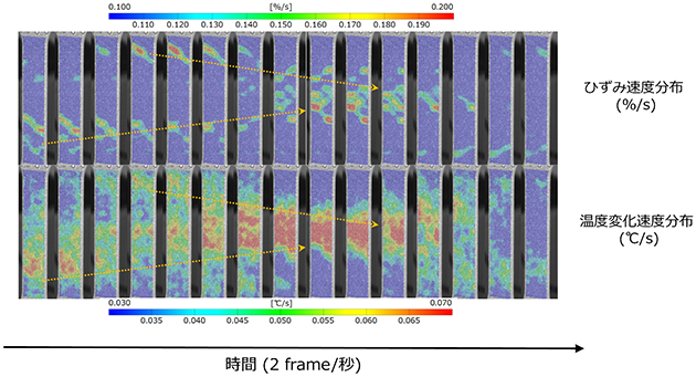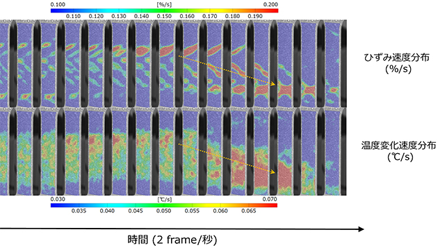 局所的な変化を見るために、ひずみと温度のいずれも変化速度、すなわち引張方向ひずみ速度と温度変化速度を分布であらわし、リューダース帯の発生個所の推移を可視化しました。