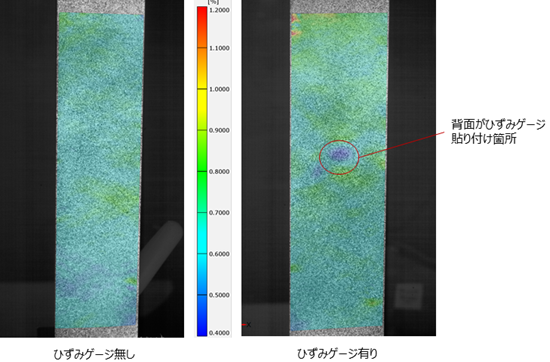 以上から、ひずみゲージを貼り付けるための接着剤により、貼り付け部およびその周辺においては拘束を受け、素材本来の材料物性と異なることが分かりました。