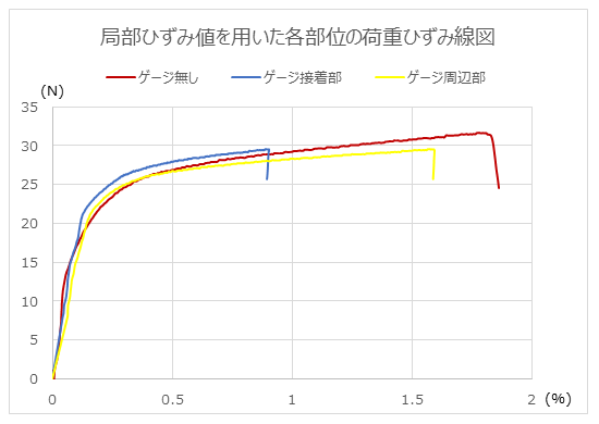 ゲージ貼り付け部周辺の荷重ひずみ線図を、ゲージがない場合の同じ部位のものと比べると以下のように差が生じることが分かりました。