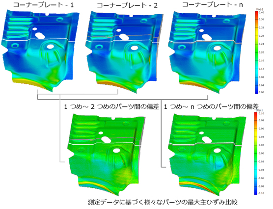 図1では、上段に左から、量産試作段階で問題なく成形された時、および量産時に抜き取りで時系列上、それぞれARGUSを用いて計測を行った最大主ひずみ分布の結果を示しています。さらに下段には量産試作時を正として、これに対する量産時の各ステップとの差分を示した分布を示しています。
