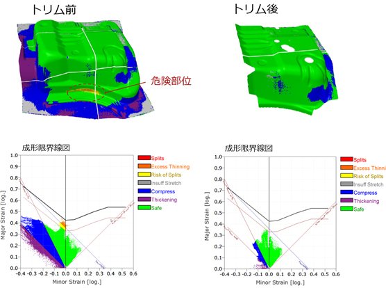 図2にその結果が示されています。図の右側はトリム後の成形余裕量の分布とFLDによる成形性の分析結果であり、トリム後では全領域ワレ危険部位は存在しないことが分かります。