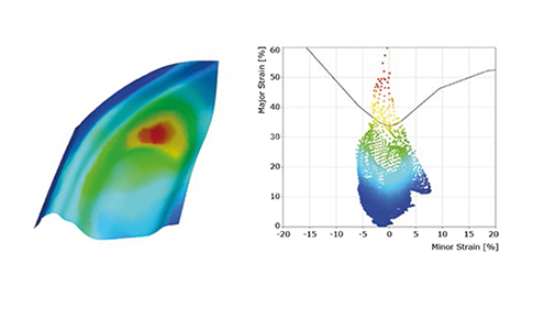 全範囲の 3D 成形分析により、成形過程で引き起こされた材料欠陥が、肉眼での確認よりも早期発見が可能です。成形限界図では、測定された形状変化がブランク材の材料特性 (成形限界曲線) と比較され、変形限界領域が検知されます。加えて、以前にシミュレーションされた形状およびひずみが全範囲かつ数値的に、実際の測定結果と比較できます。