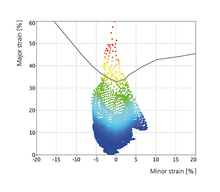 全ての結果は生成された高解像度3Dメッシュで表現され、測定対象物の表面が表示されます。ブランク材の材料特性(成形限界曲線)と測定した成形限界図(FLD)を比較評価できます。