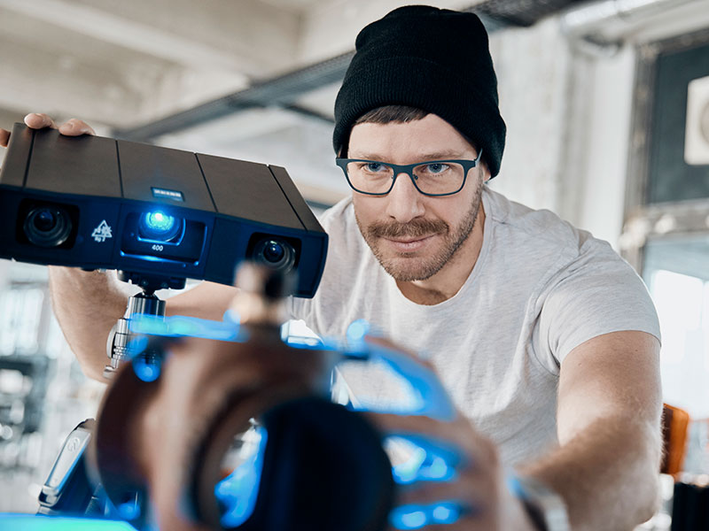 GOM Scan 1は、光学式3Dスキャナーです。青色のフリンジパターンで全体の形状を取得し、詳細な3Dデータを短時間で取得できます。
