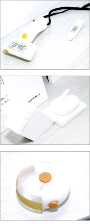 機能的にも、スタンド型にして室温計としても使えるタイプ、看護師などプロユースを想定、首にかけて携帯し「キャップを外す」「電源を入れる」「測定する」という3つの動作を1つにまとめたものもあった。