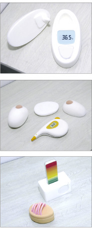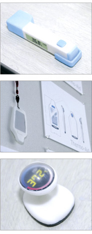 そして、従来の体温計とは思えないほど斬新なデザインのものも続々登場した。「コンピュータや機械好きの人を想定した」という、ボール状の形をした額式体 温計。エスカルゴのような形をし、半円のケースをスライドすると測定できるタイプのもの。小児科や母親が子どもの体温を測ることを想定し、カバやニュー ジーランドの動物・キウイの形をしたもの。さらに、パソコンのマウスをよりスタイリッシュにしたタイプのものなども登場した。