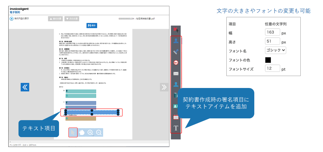 契約書面上に印鑑(スタンプ)の配置を行わずに起票を行うことができ、署名者の同意を持って電子署名とタイムスタンプの付与が可能です。