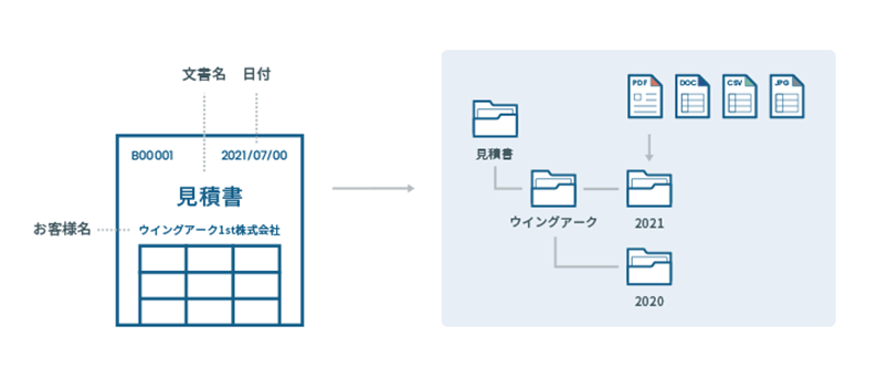 PDFやOfficeファイル、画像ファイルなどの日付や数字、文字列などの条件を読み取り、あらかじめ指定したフォルダーに仕分けます。