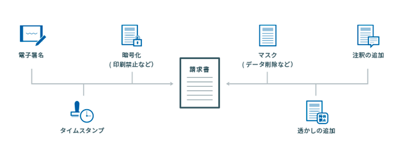 原本のPDFに手を加えることなく、仮想PDFでパスワード設定や印刷不可、透かしやマスク、などの設定が可能です。また、電⼦⽂書の信頼性を向上させるタイムスタンプや電子署名ができます。