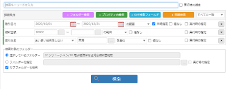 全⽂検索、⽂字、数字、⽇付、文書IDによる部分⼀致や範囲検索が可能です。また、検索条件を保存共有することで、ユーザーの検索操作を効率化します。