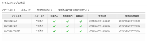 アーカイブされた文書に対して自動でタイムスタンプを付与し文書の非改ざん性を保証します。また、複数文書のタイムスタンプ一括検証が可能です。