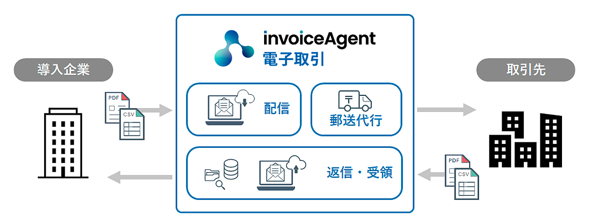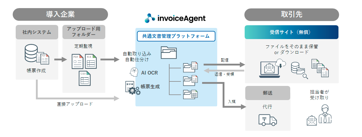| 私書箱の開設 | invoiceAgent 電子取引の未契約企業は、配信先からの招待を受けて開設。受信は無償利用可能。 |