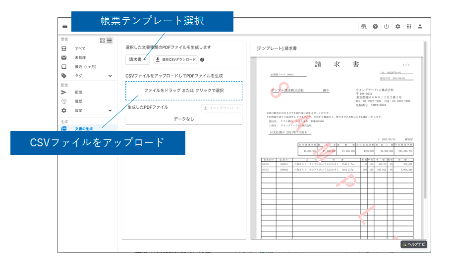 CSVファイルから請求書などのテンプレートを利用して帳票をオンデマンドで生成し、配信が可能