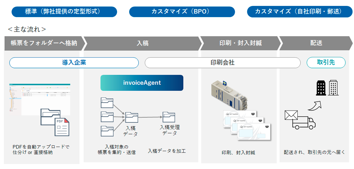 invoiceAgent に請求書をアップロードすることで、印刷会社に印刷・封入封緘・発送をアウトソーシングができるためWeb配信と郵送を両立した運用が可能です。郵送サービスは3つのタイプから選択いただくことが可能です。