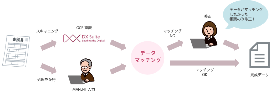 AI-OCRの認識処理時間を利用して、オペレータがMAI-ENTでデータを入力、AIOCRの処理が完了したデータとオペレータが入力したデータを照合して、照合エラーになったデータのみを、目検修正処理を行うことでデータ精度を向上します。