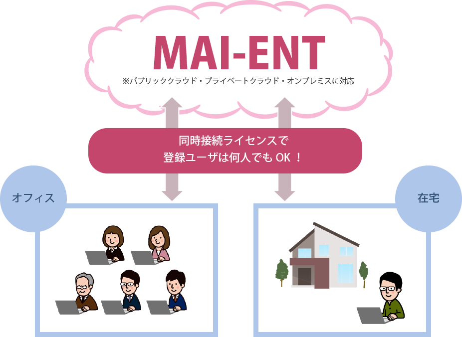 MAI-ENTはクラウド、オンプレミスのいずれの環境でも構築可能で、在宅でのリモートワークにも対応します。