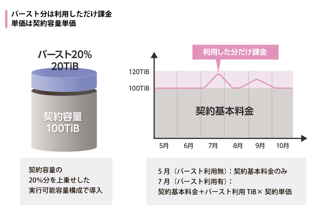| バースト | 月ごとに支払い バーストは契約容量の20%を保証 使用した容量分を契約単価で請求 |