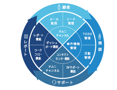 組織や役割、ロケーションに関わらず、お客様の情報を1つのCRMに集約させることで、 営業情報、訪問予定、問合せ情報、ご意見、現在の活動状況、困りごとなどお客様に関わる全ての情報を統合させます。