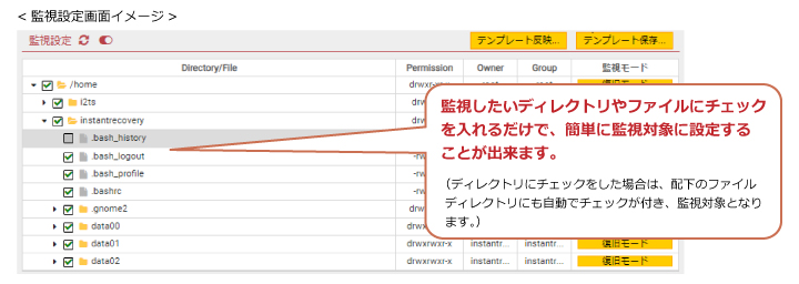 面倒な監視設定作業も、エクスプローラ上の一覧画面にて監視希望対象にチェックを入れるだけで、ご利用頂けます。また、サイト更新などで監視対象のディレクトリに追加したコンテンツは、再監視設定(最新化)の際に自動で監視対象となります。