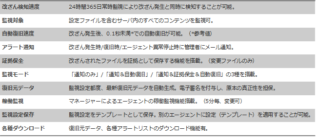 ①監視対象への変更・追加・削除イベントの発生と同時にシステムが作動するため、0.1秒以内の瞬間検知・復旧が可能です。改ざん状態をほぼ0にします。