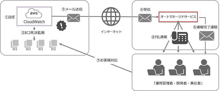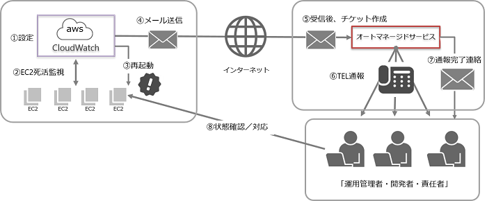 Amazon EC2監視通報サービスは、AWSにて提供されるCloudWatchからEC2のステータスを監視し、対象EC2の異常を検知した場合、当社が提供する「オートマネージドサービス」において事前登録された電話番号へ自動通報するサービスです。
