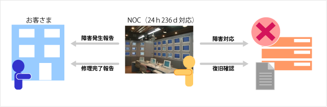 システム稼働中に障害が発生した場合、お客さまとシステム運用開始時に作成したマニュアルに基づいた対応をします。(24h365d対応)