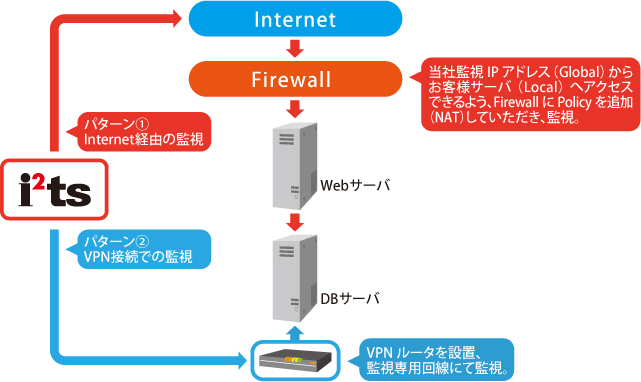 | SNMP プロトコル監視 | お客さまのSNMP対応端末から、SNMP情報を取得します。お客さまに、OIDとコミュニティ名をご指定頂き、取得した値が予め設定しておいた閾値と異なった場合に障害と判断します。 |