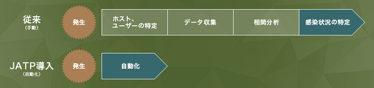 JATPは、「サンドボックスから検知した脅威情報」と、「ネットワーク内に配備されたセキュリティ機器からの情報を統合すること」で、一次対応に必要な情報だけをセキュリティ担当者へ通知します。