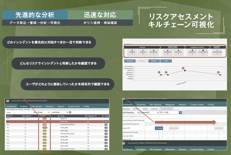 JATPでは、トラフィックとネットワーク内に配備されたセキュリティ機器から情報を収集し、リスクアセスメントを行うことにより、ネットワーク全体を通して対応の状況が一目で分かります。