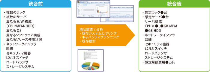 イーツは、既存システムから仮想システムへの移行をご検討のお客様に、仮想化プラットホームを構築する「VMware製品」を利用し、導入前のキャパシティプランニング、仮想化環境構築からP2Vサービス(仮想化移行作業)までトータル的なサービスをご提供します。
