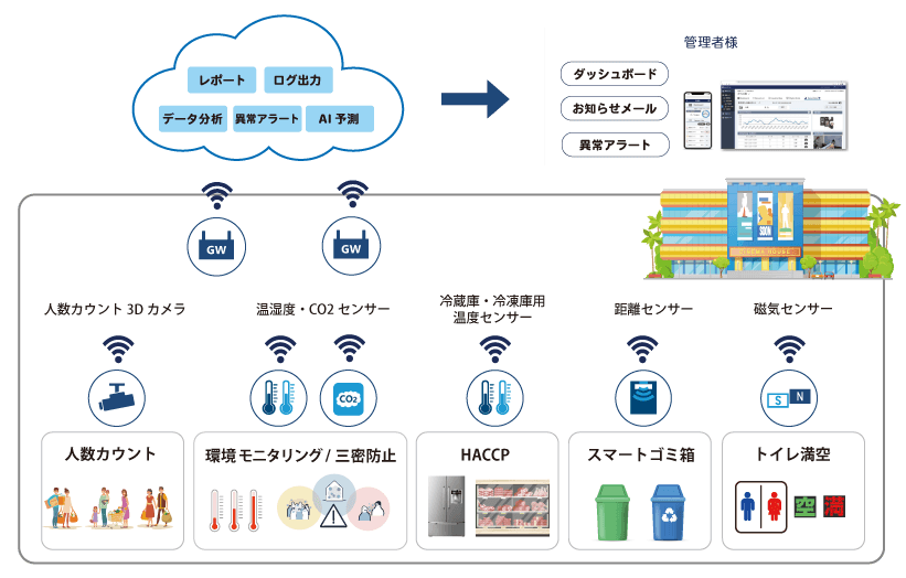 商業施設内に各種センサーを設置することにより、業務効率と販売施策データ活用(マーケティングデータ)を実現。