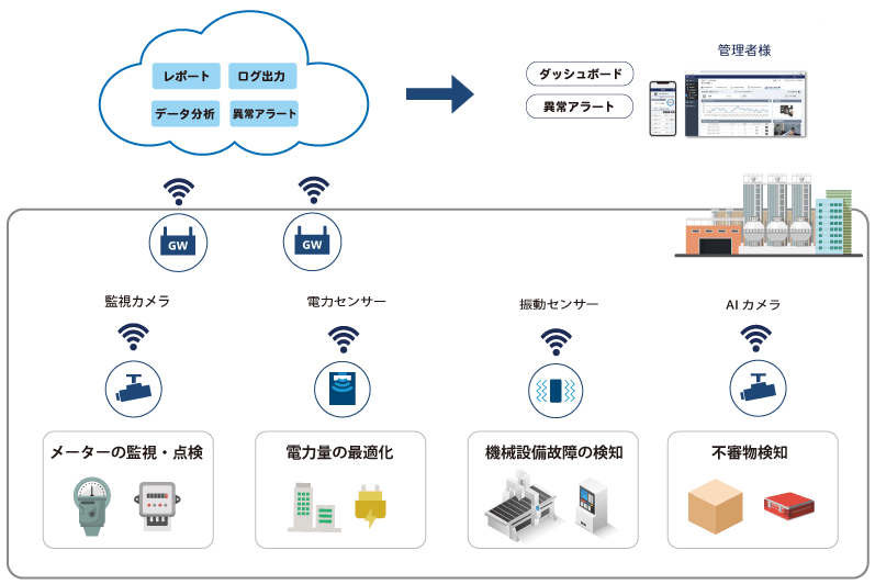 広い工場に点在しているメータの数値を遠隔から確認でき、かつ工場内の品質安定化や電力消費量の最適化を実現できます。
