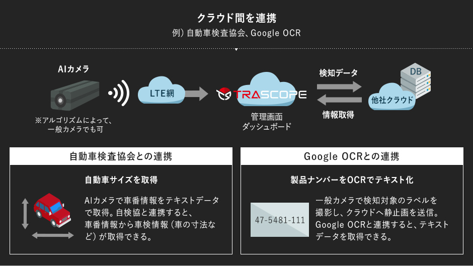 - AIカメラで車番を読取り、テキストデータ・検知画像をクラウドに送信。