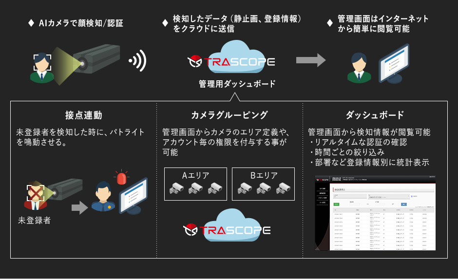 - 検知したときに、管理者に通報します。現場に行かなくても管理画面からライブ映像の確認が可能。