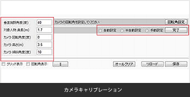 それぞれのパラメータがわかっている場合は直接入力にて設定が可能ですが、カメラ高さと傾斜角度は、あらかじめ身長(高さ)のわかっている人物等の画面上の位置での見え方により、自動で計測することも可能です。