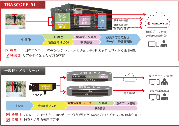 TRASCOPE-AIカメラは、映像をローデータのまま直接GPUでAI処理するため、CPU使用ロスが無く、装置コストや通信費用が大変安価になります。監視カメラの機能も同時に利用できるため、導入時、ダブルコストになりません。